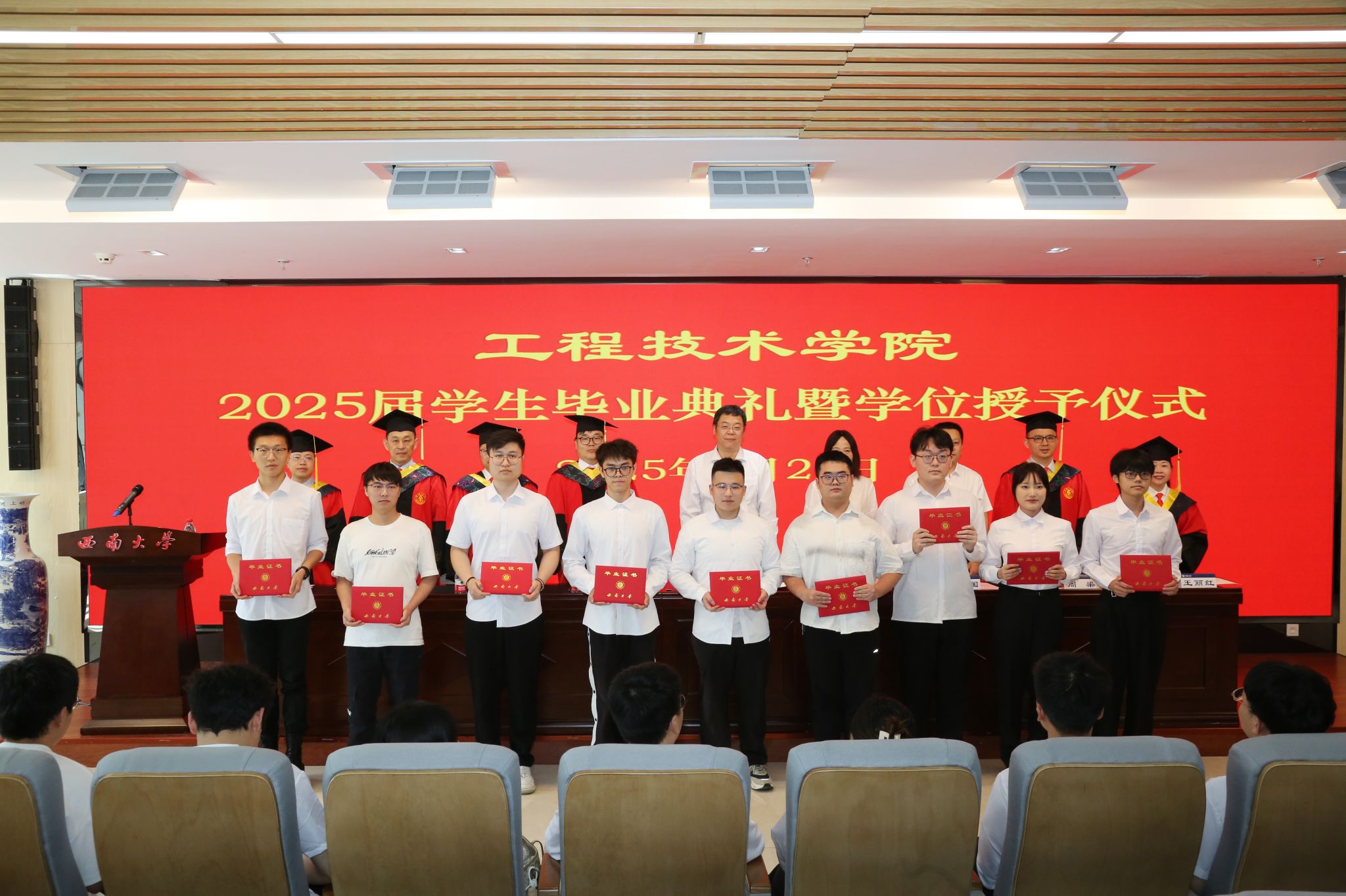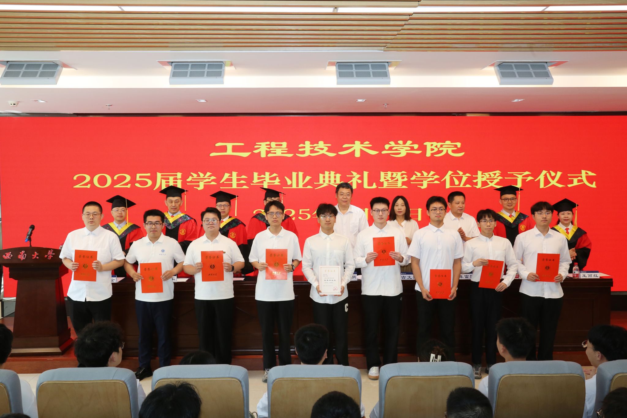 关于准予2025年全日制普通本科学生、研究生毕业的决定。我院共有422名应届全日制普通本科学生、6名博士研究生、98名硕士研究生被准予毕业。主席台就坐领导和老师为毕业生代表颁发了毕业证书。