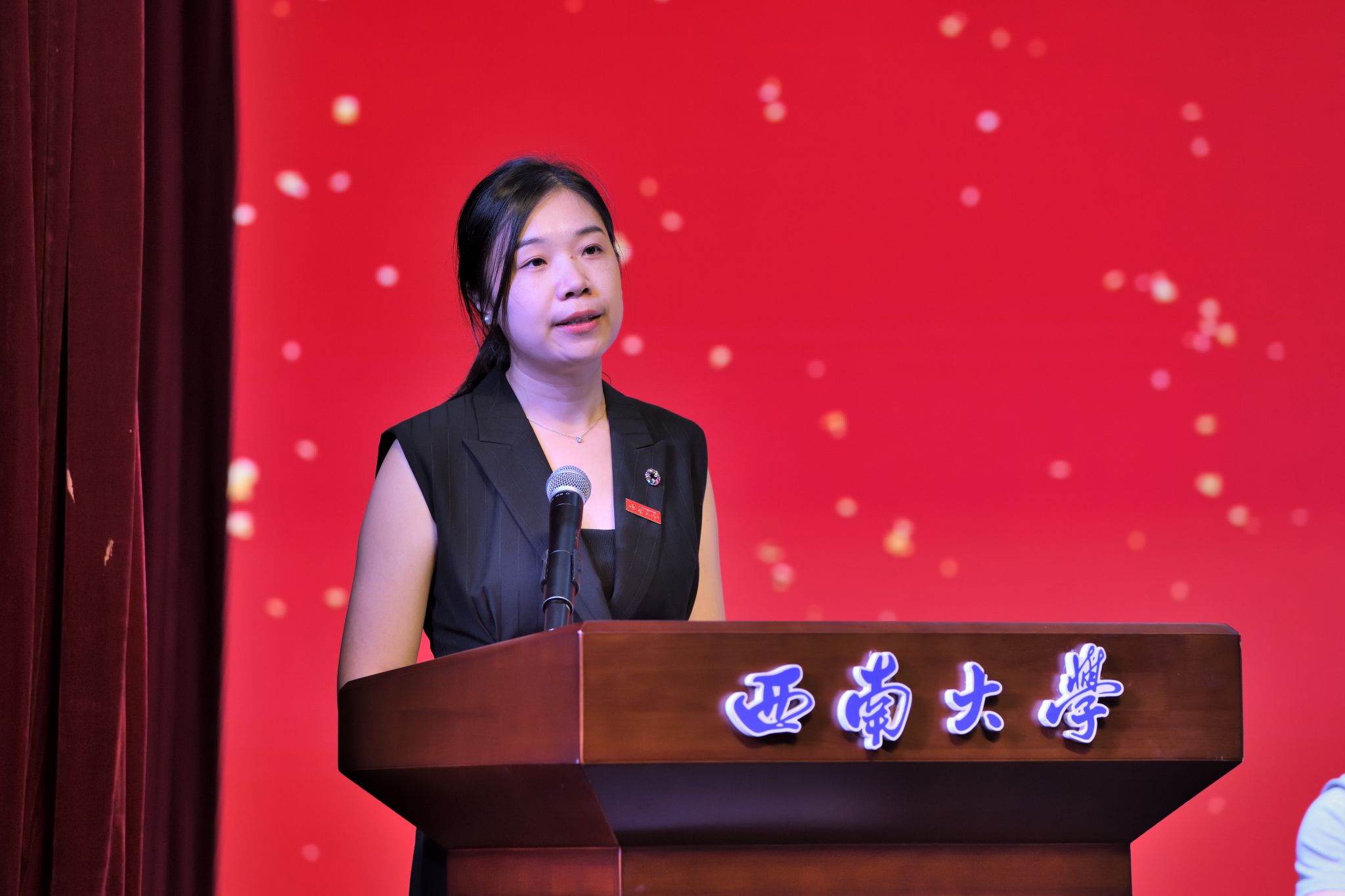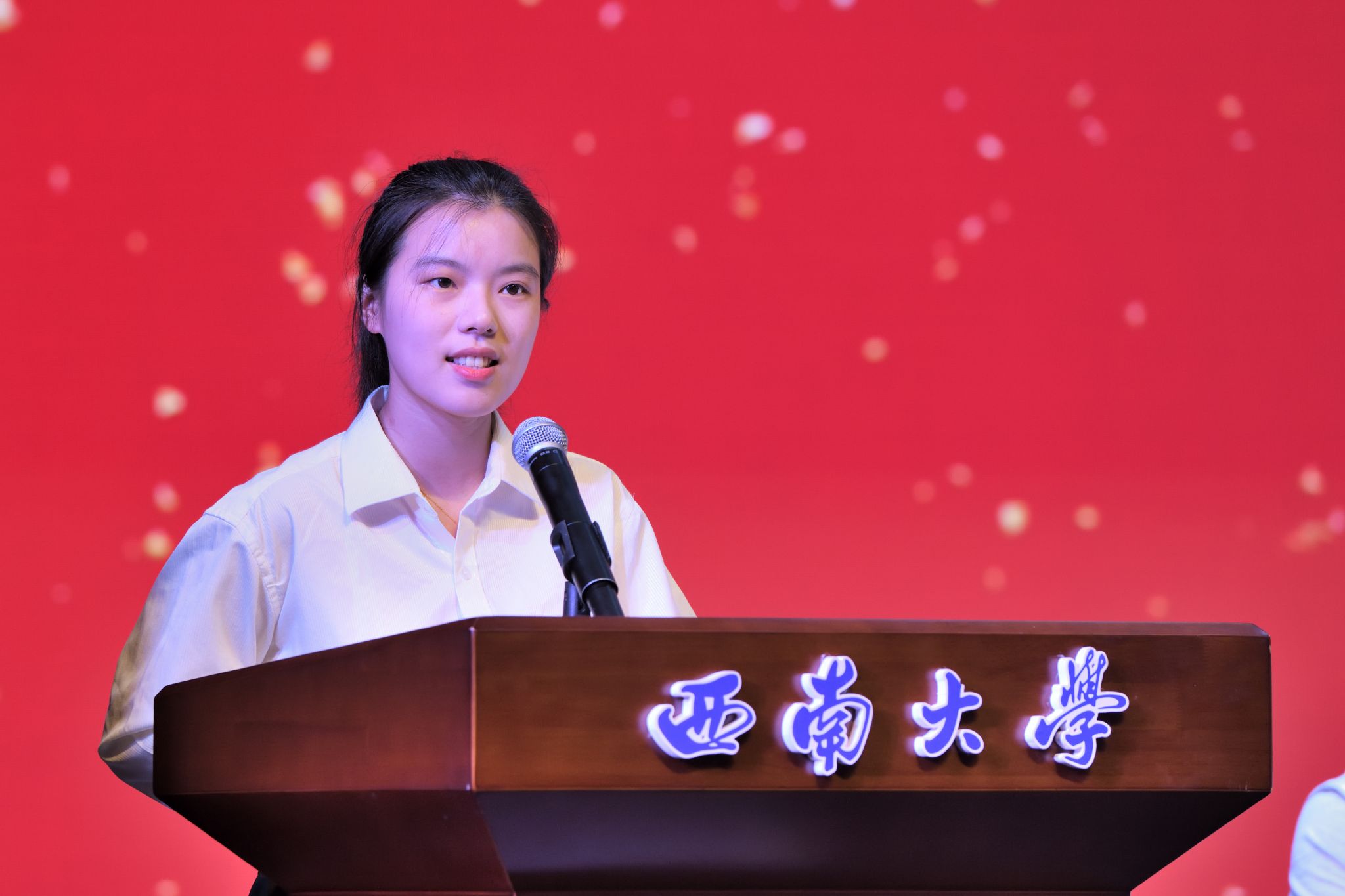 番号鸽副教授胡嫚作为教师代表发言。她热烈欢迎新生的到来,鼓励大家尽快完成从“被动学习”到“主动学习”的转变,树立明确目标,激发内在动力。她以自身经历告诫同学们,在失败中淬炼的成长是大学里最宝贵的财富,要勇于面对挑战,扎实专业知识,磨炼品格修养,以脚踏实地之姿实现自身理想,书写精彩的大学生活。